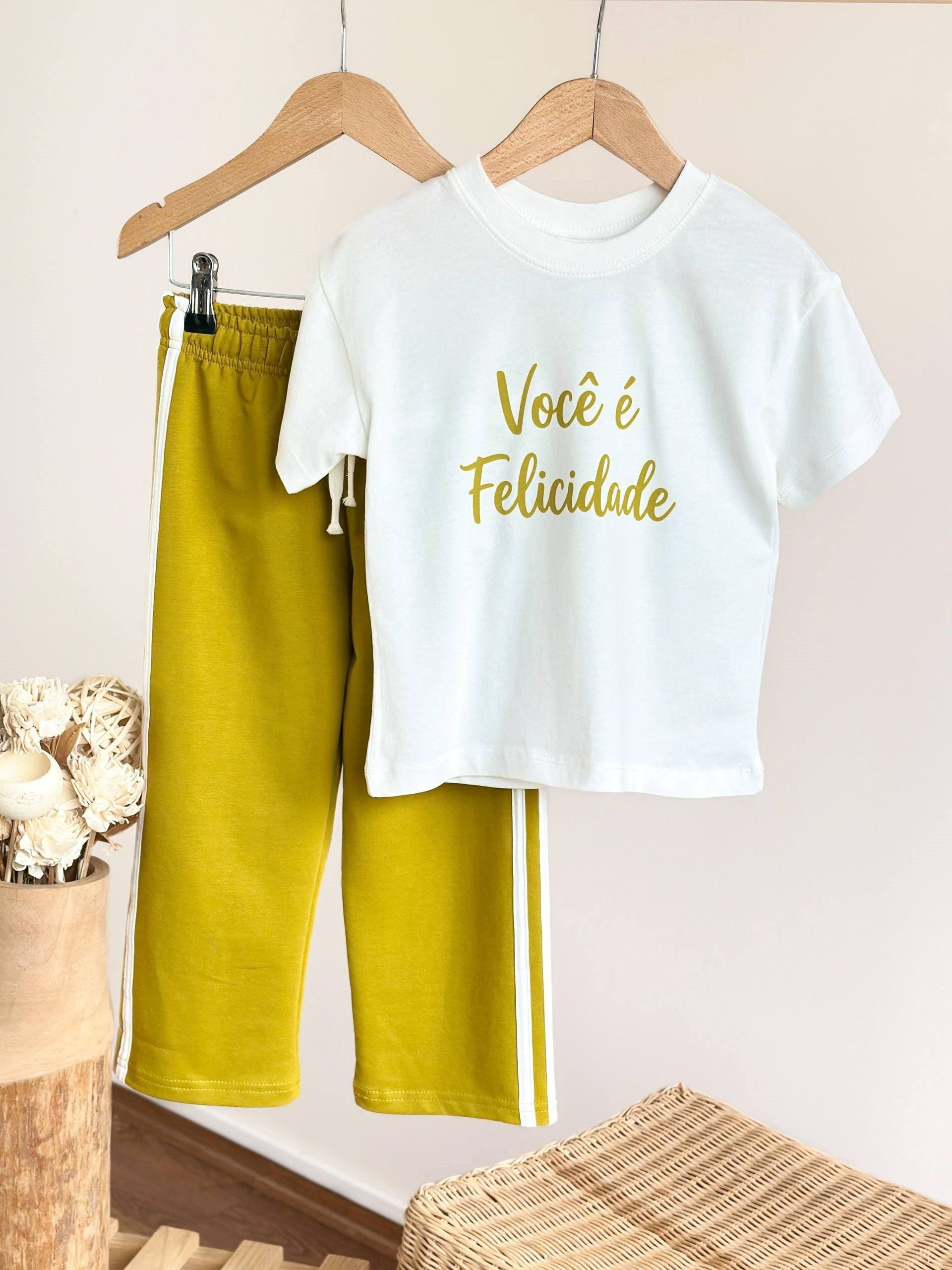Ürün Açıklaması: Minimal tasarımı ve zarif yazı detayıyla öne çıkan bu kız çocuk takımı, sade şıklığı ve konforu bir arada sunar. Tişört üzerindeki “Você é Felicidade” baskısı ürüne anlamlı bir dokunuş katarken, uyumlu eşofman altı ile kombin tamamlanır. Yumuşak ve nefes alabilen kumaşı sayesinde gün boyu rahat kullanım sağlar.